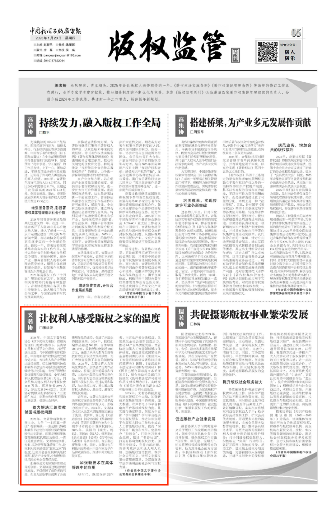 2024年,中国文字著作权协会(以下简称文著协)在相关管理部门的关怀指导下,认真学习贯彻习近平文化思想、习近平法治思想,与中国摄影著作权协会、中国电影著作权协会成立联合党支部,为权利人和产业界解决版权难题,切实履行报刊转载和教科书法定许可版权使用费收缴转付法定职能,有效开展版权集体管理和版权贸易,全年为权利人收取版权费2311万元,向会员和其他权利人转付版权费1146万元,惠及作者2395人次,涉及文章3944篇次。文著协对稿酬分配转付实行“三主动”方法,定期公告作者不明的文章信息,受到社会好评。2025年,文著协将聚焦主责主业,力争“一主两翼一责任”有新突破:一主是报刊转载和教科书法定许可版权费收缴和转付法定职能,两翼是版权集体管理和版权代理以及维权,一责任是社会责任。文著协将执着、专业、高效开展集体管理工作,让权利人时刻感受到“版权之家”的温度,让使用者感受到解决版权难题、促进产业发展,化解版权法律风险的专业负责任态度。汇编权是文著协集体管理业务的创新。文著协通过规范的授权流程,不仅保障了创作者的利益,而且为出版单位提供了合法使用作品的途径,促进了出版业的健康发展。2024年,授权汇编作品超过500种,合作单位200余家,收转版权费接近1800万元,涵盖了从幼儿教育至高等教育的全阶段语文课外读物,为广大读者提供了丰富的阅读资源。2025年,文著协将大力发展优质会员,加快会员优秀作品库建设,根据出版市场需求和行情,主动向出版单位推荐优秀作品。同时针对会员投诉较多的教辅图书侵权机构,经过沟通和取证,加大维权力度,努力解决著作权人最关心、最直接、最现实的版权难题。近年来,文著协在戏剧公开表演权方面的业务得到了诸多海内外剧院和剧作家的认可,影响力逐步扩大。2024年,文著协为北京人民艺术剧院等院团解决了美国、俄罗斯、瑞士的《大酒店套房》《华沙旋律》《罗慕路斯大帝》等剧目原著剧作家和中文剧本译者的公开表演权授权。2025年,美国的《晚安,妈妈》、英国的《情人》、俄罗斯的《老式喜剧》《长椅》《我可怜的马拉特》等多部话剧、音乐剧还要继续上演。同时,文著协也在积极向海外输出中国作家文学作品和戏剧作品,推动中外文明交流互鉴。AI时代,既要保护创作者、内容生产者合法权益,又要激发全社会创新创造活力,推动AI产业高质量发展。文著协将加强人工智能领域版权保护研究,高质量完成国家社科基金特别委托项目《生成式人工智能语料库建设著作权法律问题研究》课题、《提高教科书法定许可付酬标准调研》和《图书出版合同示范文本委托项目》,配合推动相关部门尽快修改《教科书法定许可使用作品支付报酬办法》,实时发布《图书出版合同示范文本》和版权输出合同示范条款。2025年,文著协将按照党和国家版权工作大局,加强新技术在集体管理中的应用,加大教辅、有声书电子书平台和电商平台等领域维权力度,扎实履行法定职责,继续为中宣部“学习强国”学习平台提供专业版权服务,推进知识资源平台版权共同体工作和生成式人工智能版权研究,提高“四个服务”能力和水平,定期举办“悦读会”,打造学习型社会组织、建设“书香社团”,打造有影响力的版权沙龙。加强自身建设,完善内部治理,完善考核评议和选人用人机制,加强版权宣传教育,维护社会公平正义,谱写文字版权集体管理新篇章,为营造尊法守法学法用法的社会风气贡献力量。(作者系中国文字著作协会常务副会长兼总干事 张洪波)